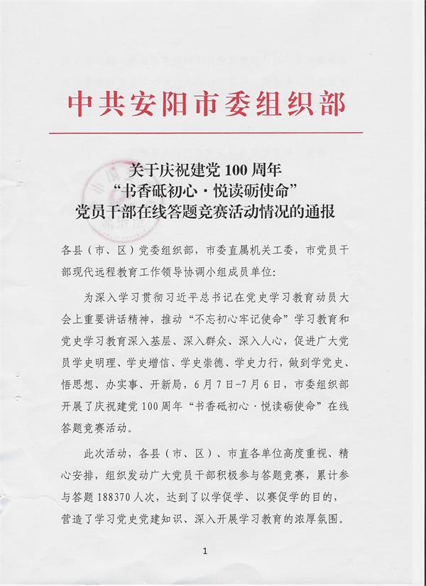 2021年6月7日——7月6日,按照中共安陽(yáng)市委組織部《關(guān)于開(kāi)展慶祝建黨100周年“書香砥初心·悅讀礪使命”黨員干部在線答題競(jìng)賽活動(dòng)的通知》要求,公司各黨支部積極組織黨員、預(yù)備黨員、入黨積極分子關(guān)注“安陽(yáng)黨建”微信公眾號(hào),踴躍參與線上答題活動(dòng)。