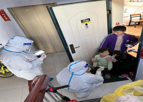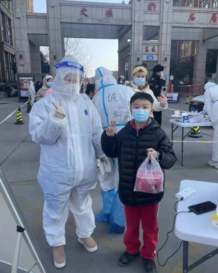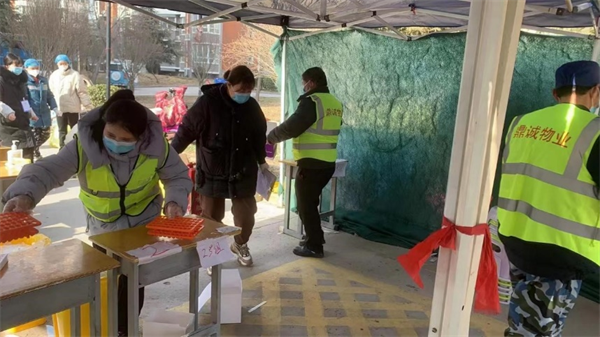 “這邊的業(yè)主請您按序排隊,別插隊,咱們是按照十人一組的順序來的,別慌,很快!”這是韓秀紅和李曉茜每天說的最多的一句話。剛開始,很多業(yè)主對他們不理解,不耐煩,她們總是耐心地對業(yè)主們微笑解釋。隨著核酸測試次數(shù)的增加,業(yè)主們對她們的工作也開始理解,也主動配合她們的工作。針對那些居家隔離或不方便下樓做核酸的業(yè)主,她們就和醫(yī)護人員一起上門幫業(yè)主做核酸。每一次核酸檢測結束后,她倆重新戴上手套,拿上掃把,對核酸現(xiàn)場再進行清理收尾工作。