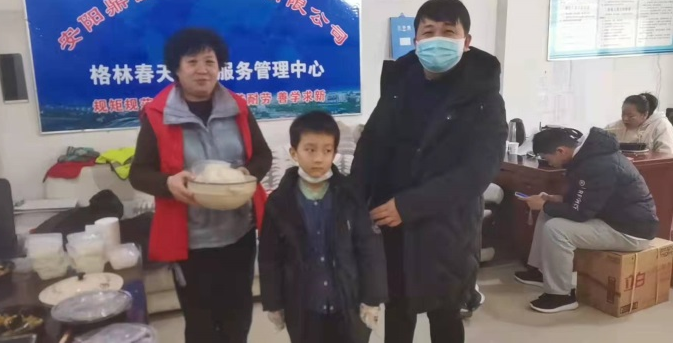 1月16日晚上6時,格林春天項目部辦公室突然來了幾名業(yè)主。他們有的端著鍋,有的拎著袋子,辦公室工作人員張玉青還沒反應過來,業(yè)主們已將手中的東西放了一大桌子,袋子里熱乎乎的飯菜香味在空氣中彌漫,綠白相間的蔬菜花卷兒、酸湯皮渣、酥肉丸子、油炸花生米、炒蔬菜、一大鍋米飯,還有一只畫寶剛燒雞,真是豐盛······