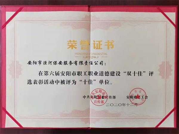 為深入學(xué)習(xí)貫徹習(xí)近平新時(shí)代中國特色社會(huì)主義思想和黨的十九大精神,積極踐行社會(huì)主義核心價(jià)值觀,進(jìn)一步提升職工職業(yè)道德建設(shè)水平,為決勝全面建成小康社會(huì),加快實(shí)現(xiàn)“一個(gè)重返、六個(gè)重大”目標(biāo)任務(wù),建設(shè)新時(shí)代區(qū)域性中心強(qiáng)市作出新的更大貢獻(xiàn),日前,經(jīng)安陽市“雙十佳”評(píng)委會(huì)評(píng)審,中共安陽市委宣傳部、安陽市總工會(huì)決定:授予安陽市洹河保安服務(wù)有限責(zé)任公司“安陽市職業(yè)道德建設(shè)十佳單位”榮譽(yù)稱號(hào)。