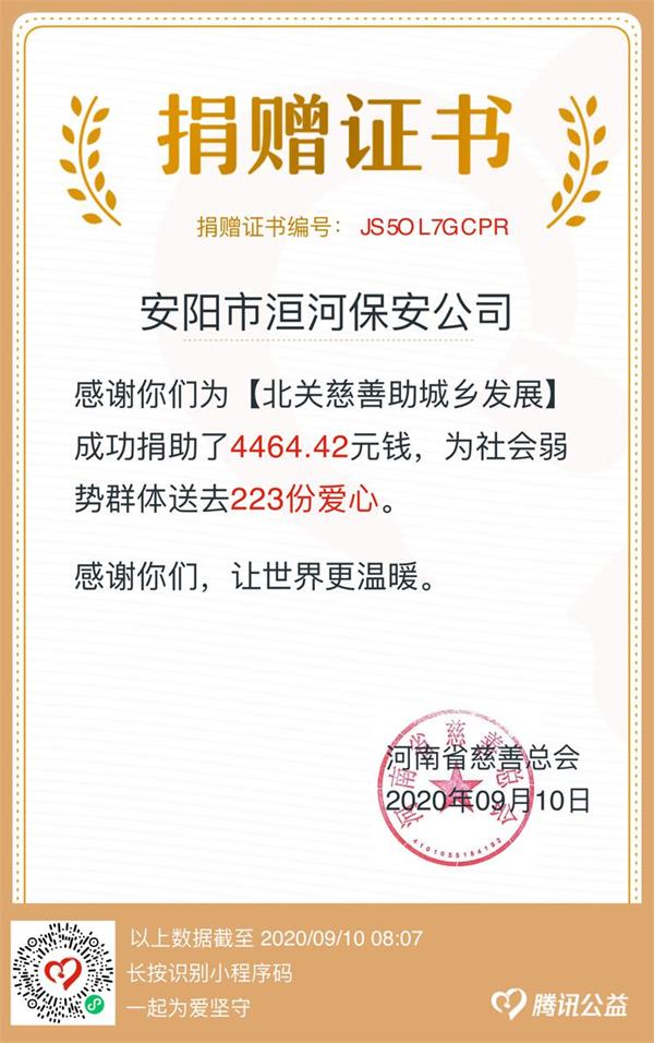 為弘揚(yáng)中華傳統(tǒng)美德,助力慈善事業(yè)發(fā)展,充分發(fā)揮互聯(lián)網(wǎng)在慈善活動(dòng)中的重要作用,9月7日—9月9日,安陽市洹河保安公司組織開展“99公益日”慈善捐款活動(dòng),全體干部職工通過網(wǎng)絡(luò)愛心捐款共計(jì)4464.42元。