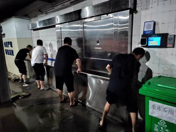當(dāng)晚,他們對地下室以及金庫門前實施防汛措施,隨著水位逐漸升高,隊員們各自就位提高警惕,按照預(yù)案要求,全力以赴保障金庫和內(nèi)部安全。