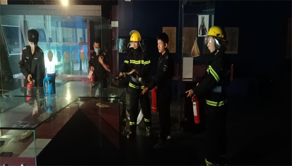 活動現場,時兆東下達演習開始指令。各組人員按照預定方案立即到位,發(fā)現玉器廳有“火情”,及時確認上報,備勤隊員迅速穿戴防護裝備趕赴火場撲救,館內工作人員疏散游客,開辟防火帶,清點人員,做好現場善后處理工作。各組人員各盡其責,緊密配合,經過共同努力, “火情”被撲滅,消防演習取得圓滿成功。