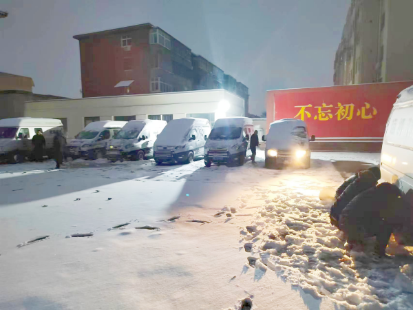 命令下達(dá),隊(duì)員們紛紛出動(dòng),冒著嚴(yán)寒、頂著大雪,小心翼翼的趕到大隊(duì),進(jìn)行出車前的準(zhǔn)備工作。隊(duì)員們配合默契、行動(dòng)迅速,司機(jī)在大隊(duì)領(lǐng)導(dǎo)的帶領(lǐng)下給押運(yùn)車輛安裝防滑鏈;隊(duì)員在車長的指揮下拿起鐵鍬,鏟除積雪;還有一些隊(duì)員在清理駐地路面,撒上化雪鹽,確保正常出車。