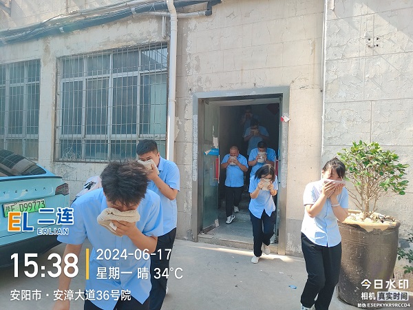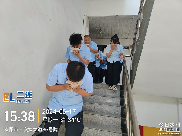 消防逃生演練模擬了公司大樓內某處發(fā)生火災的場景,全體人員在李衛(wèi)軍的指揮下,用濕毛巾捂住口鼻,彎腰沿著樓梯兩側的疏散路線快速、有序地向樓下撤離至安全地帶。整個演練過程緊張有序,達到了預期的效果。