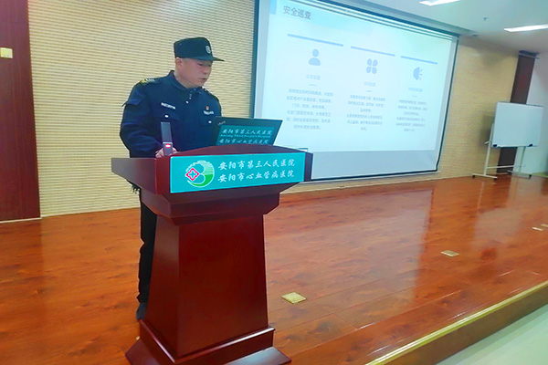 3月11日上午,人防二大隊教官楊承濤應(yīng)第三人民醫(yī)院之邀,在醫(yī)院行政報告廳為該院30余名安保人員開展崗位技能專項培訓(xùn)。副院長徐江海、保衛(wèi)科科長王惠偉和人防二大隊副大隊長張海林、尚斌參加。