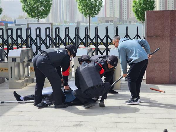 按照應(yīng)急預(yù)案,當(dāng)班的3名保安迅速分工。一人持防暴盾牌正面封堵“歹徒”前進(jìn)路線,兩人持鋼叉從側(cè)后方包抄。面對(duì)“歹徒”的揮砍威脅,保安團(tuán)隊(duì)采用“盾牌交叉防御+鋼叉鎖喉控制”戰(zhàn)術(shù),逐步壓縮其活動(dòng)空間。在與“歹徒”周旋的2分鐘內(nèi),最終協(xié)同將“歹徒”制服。此時(shí)園區(qū)已完成師生避險(xiǎn)疏散,警方支援力量也同步抵達(dá)現(xiàn)場(chǎng)。