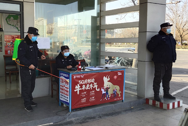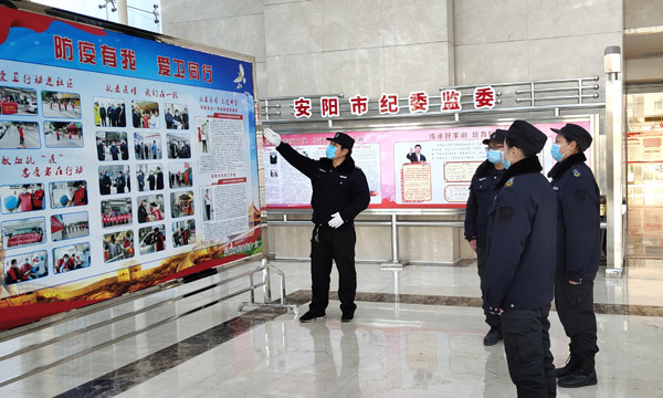 目前,中隊(duì)全體隊(duì)員表示,要以飽滿的工作熱情積極工作,保障客戶安全,為客戶度過一個(gè)平安祥和的春節(jié)做出自己的貢獻(xiàn)。圖為隊(duì)員在學(xué)習(xí)疫情防控知識、對崗點(diǎn)進(jìn)行消殺、測量外來人員體溫。