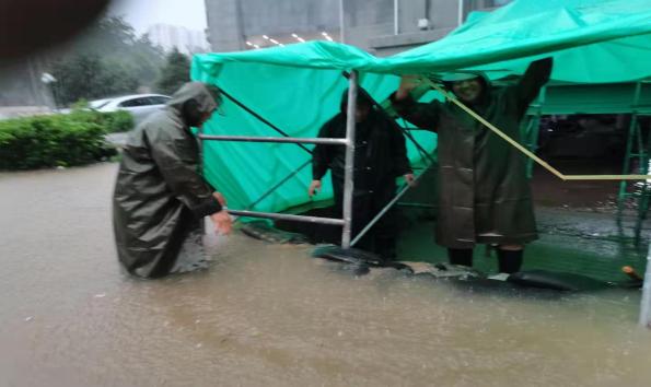 災(zāi)情就是命令,搶險就是責(zé)任。駐安陽分行人防一大隊隊長翟根平同志第一時間啟動應(yīng)急預(yù)案,立即安排帶班隊員輪流值班,在大院門口迅速堆起防汛沙袋建立防汛墻,阻止雨水灌入,對地下車庫里放置的自助設(shè)備、機(jī)房庫房、金庫進(jìn)行了重點(diǎn)排查,同時對大院外圍洪澇災(zāi)害情況時刻進(jìn)行監(jiān)控排查。