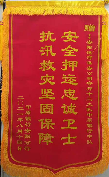 中原銀行安陽(yáng)分行行長(zhǎng)吳擁軍親自為守押十二大隊(duì)贈(zèng)送了錦旗并贈(zèng)言:押運(yùn)隊(duì)員在這次抗擊災(zāi)情的戰(zhàn)斗中,面臨險(xiǎn)情,不懼危險(xiǎn),身先士卒,敢打敢拼,勇往直前,為這次突如其來(lái)的災(zāi)情作出了突出的貢獻(xiàn);體現(xiàn)了寶貴的擔(dān)當(dāng)精神,彰顯了洹河押運(yùn)隊(duì)伍訓(xùn)練有素的過(guò)硬作風(fēng)和鋼鐵意志。