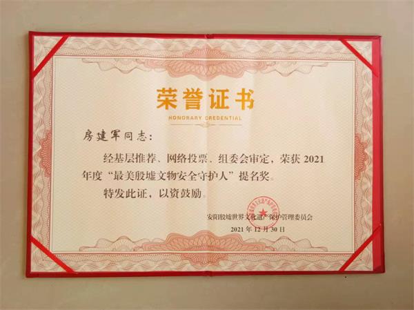 2021年12月31日上午,殷墟管委會(huì)在殷都區(qū)政府南三樓舉行“最美殷墟文物安全守護(hù)人”頒獎(jiǎng)暨“殷墟”官網(wǎng)開通慶典儀式。人防二大隊(duì)駐龍安殷墟文物安全網(wǎng)格巡邏隊(duì)房建軍同志獲得“最美殷墟文物安全守護(hù)人”提名獎(jiǎng),受到龍安殷墟文物安全網(wǎng)格化管理工作簡報(bào)通報(bào)表揚(yáng),安陽殷墟世界文化遺產(chǎn)保護(hù)管理委員會(huì)頒發(fā)了榮譽(yù)證書。