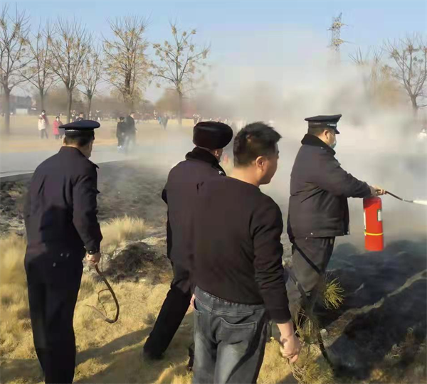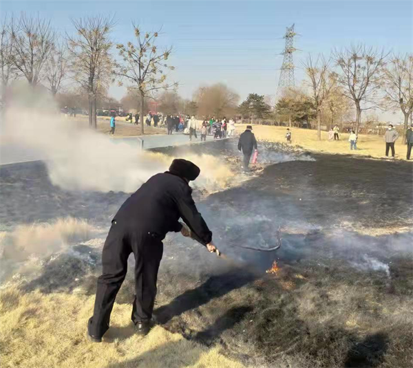 2月19日下午4點(diǎn),人防四大隊(duì)殷都區(qū)文廣新局保安班長(zhǎng)王俊峰和隊(duì)員郝彥軍像往常一樣,按照規(guī)定的線(xiàn)路執(zhí)行安保巡邏,當(dāng)他們?cè)谝笮骈T(mén)口巡邏執(zhí)勤時(shí),發(fā)現(xiàn)殷墟廣場(chǎng)前草坪上冒起濃濃黑煙,有火險(xiǎn),他們隨即趕到火險(xiǎn)現(xiàn)場(chǎng),班長(zhǎng)王俊峰和郝彥軍隨手撿起地上的木棍進(jìn)行滅火,王俊峰通知郝彥軍趕快上報(bào)殷墟警務(wù)室,殷墟警務(wù)室王隊(duì)長(zhǎng)得知后,立即帶領(lǐng)警務(wù)室所有隊(duì)員拿著滅火器趕到現(xiàn)場(chǎng)進(jìn)行滅火。由于發(fā)現(xiàn)及時(shí),在大家的共同努力下,將草坪上的明火撲滅。