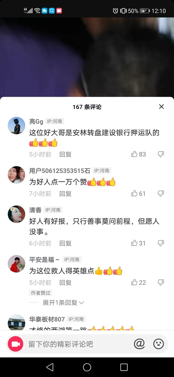 6月6日晚10時30分左右,韓海根、劉玉峰、張彩軍、徐現(xiàn)強等四人下班后前往林州龍湖散步遛彎。當行至涼亭下面時,他們聽見“撲通”的落水聲,韓海根隱約看到附近的一位紅衣女子跳下了龍湖,他們借著夜色發(fā)現(xiàn)該女子在水里掙扎,此時,韓海根、劉玉峰、張彩軍、徐現(xiàn)強四人迅速趕到落水點查看情況,旁邊已經(jīng)有路人在圍觀,但卻沒人下去營救,此時,隊員徐現(xiàn)強立即跳下去前去營救,韓海根、劉玉峰、張彩軍打開手機電源為其進行照明指揮,經(jīng)過大家的努力,成功將落水女子救了上來。此時有路人已經(jīng)撥打了120和報警電話,救護車趕到后,四人合力又將落水女子抬上了救護車,路邊的群眾紛紛為其四人的行為點贊,并被路邊群眾拍攝視頻上傳到了抖音上,贊揚他們弘揚了社會正氣,傳遞了社會正能量,為四人的挺身而出和俠義之舉點贊。