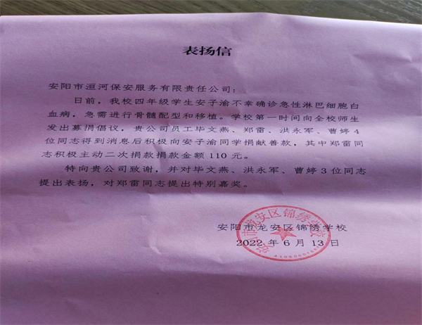 6月13日,錦繡學(xué)校四年級(jí)學(xué)生安子渝不幸確診急性淋巴細(xì)胞白血病,急需進(jìn)行骨髓配型和移植。學(xué)校第一時(shí)間向全校師生發(fā)出募捐倡議,人防四大隊(duì)駐學(xué)校員工畢文燕、鄭雷、洪永軍、曹月婷 4位同志得到消息后積極向安子渝同學(xué)捐獻(xiàn)善款,其中鄭雷同志積極主動(dòng)二次捐款110元。錦繡學(xué)校得知情況后提出對(duì)畢文燕、洪永軍、曹月婷進(jìn)行表?yè)P(yáng),對(duì)鄭雷特別嘉獎(jiǎng),向洹河公司發(fā)來表?yè)P(yáng)信。