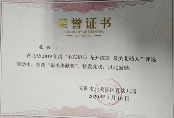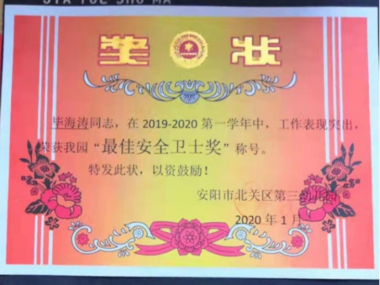 獲獎隊員中,駐北關區(qū)區(qū)直幼兒園張強在2019年度“不忘初心 花開綻放 美麗北幼人”評選活動中,榮獲“美麗奉獻獎”;駐北關區(qū)博雅幼兒園常保安在“美麗博雅人”評選中,被評為“杰出奉獻獎”;駐北關區(qū)第三幼兒園畢海濤榮獲“杰出安全衛(wèi)士獎”稱號。自該大隊擔負北關區(qū)教育系統(tǒng)安全保衛(wèi)工作以來,駐各小學、幼兒園保安員夯實保安技能,開展應急處置預案演練,認真履行職責,為創(chuàng)建平安校園做出了突出貢獻。