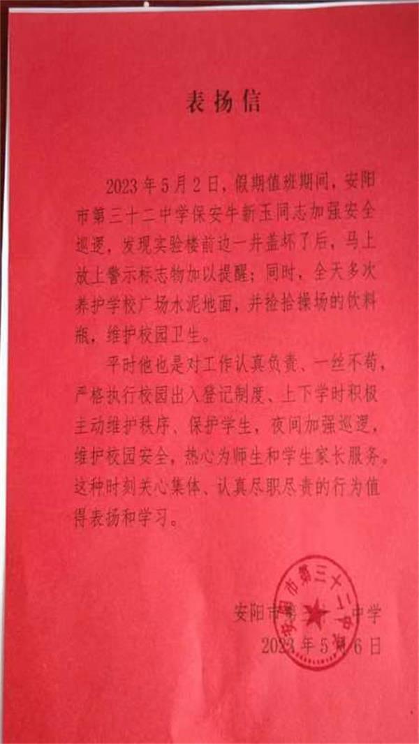 信中說道:5月2日,假期值班期間,牛新玉同志加強安全巡邏,發(fā)現(xiàn)學(xué)校實驗樓前邊一井蓋壞了后,馬上放上警示標志加以提醒;同時,全天多次養(yǎng)護學(xué)校廣場水泥地面,并撿拾操場的飲料瓶,維護校園衛(wèi)生。平時牛新玉同志對工作認真負責(zé)一絲不茍,嚴格執(zhí)行校園出入登記制度、上下學(xué)時積極主動維護秩序、保護學(xué)生,夜間加強巡邏,維護校園安全,熱心為師生和學(xué)生家長服務(wù)。這種時刻關(guān)心集體、認真履職盡責(zé)的行為值得表揚和學(xué)習(xí)。