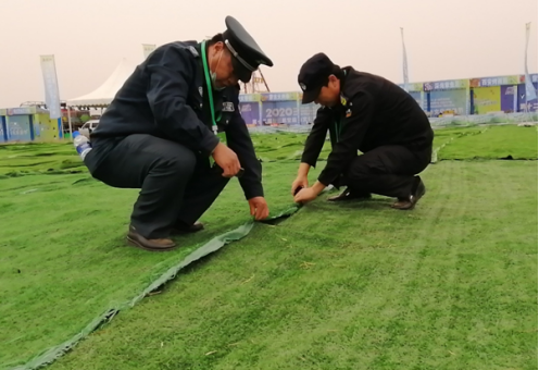 昨日,航空節(jié)首日活動結(jié)束后,會場上的草坪地毯被晚上的大風(fēng)刮得亂七八糟,觀眾走上去很容易被絆倒。為確保今天晚上的電音節(jié)活動正常進(jìn)行,客戶希望抽調(diào)部分在場執(zhí)勤人員幫助修整一下。公司現(xiàn)場負(fù)責(zé)任人收到客戶請求幫助的信息后,在保障安全的情況下,合理調(diào)配執(zhí)勤人員,抽調(diào)出23名執(zhí)勤人員,幫助客戶整理會場上的草坪地毯。