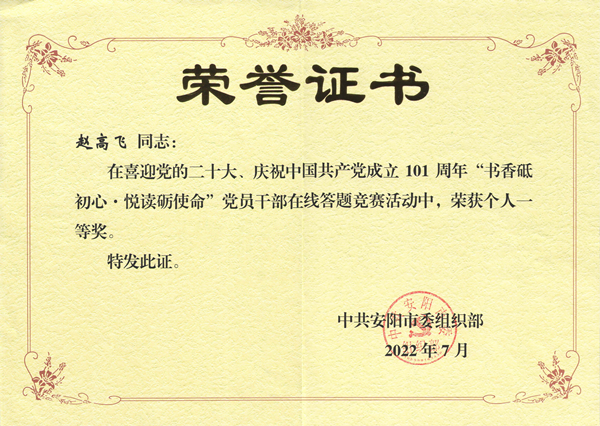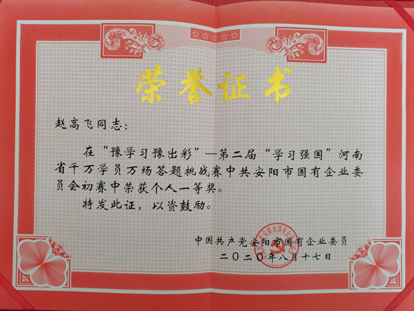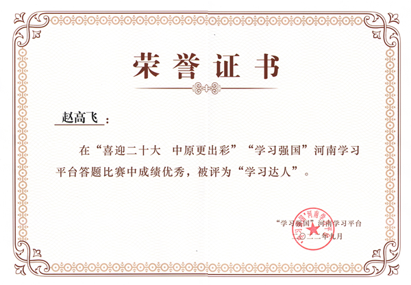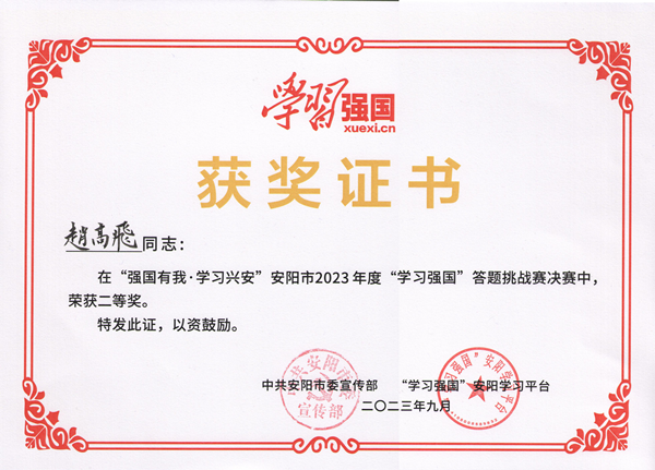趙高飛,35歲,中共黨員,本科學歷,現(xiàn)任鼎信子公司副經(jīng)理,自“學習強國”平臺上線以來,趙高飛學習成績屢創(chuàng)新高,先后榮獲2020年度學習強國挑戰(zhàn)賽安陽市賽區(qū)決賽“個人三等獎”,2021年度安陽市黨員干部在線答題競賽“個人三等獎”,2022年度學習強國河南學習平臺“喜迎二十大、中原更出彩”答題比賽“周達人”及“學習達人”,2023年度“強國有我 學習興安”學習強國答題挑戰(zhàn)賽安陽市決賽“個人二等獎”,2023年度學習強國河南學習平臺“貫徹二十大精神、建設現(xiàn)代化河南”強國答題比賽“周達人”。學習從來都不是一蹴而就的,這些成績的獲得,是趙高飛日積月累堅持學習的成果。