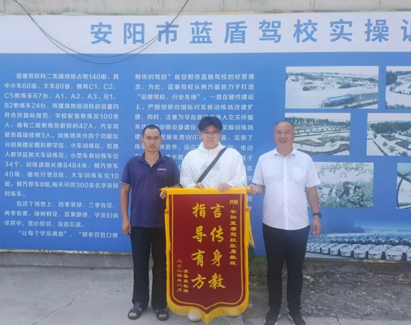 一面錦旗,一個(gè)故事;一聲肯定,一份責(zé)任。8月23日一大早,已經(jīng)成功拿證、順利畢業(yè)的學(xué)員蘇嘉豪特意來(lái)到藍(lán)盾駕校訓(xùn)練場(chǎng),將一面印有“指導(dǎo)有方 言傳身教”字樣的錦旗,鄭重地送到了教練員張勇的手中,對(duì)學(xué)車(chē)期間教練的辛勤付出表示深深的感謝以及對(duì)藍(lán)盾駕校的肯定。