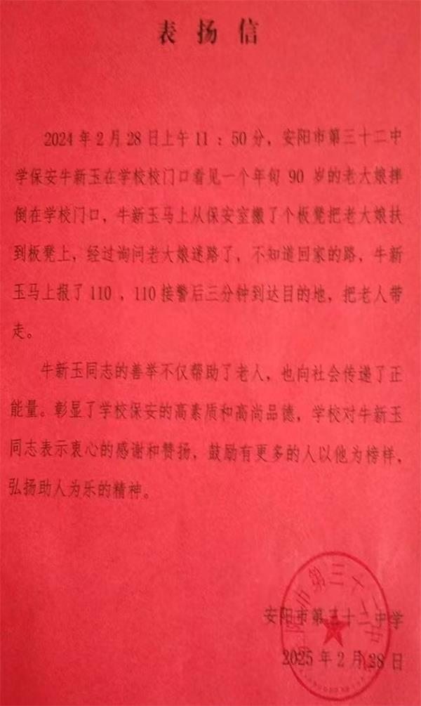 隊(duì)員牛新玉的善舉不僅幫助了老人,也向社會(huì)傳遞了正能量,彰顯了洹河保安的高素質(zhì)和高尚品德。學(xué)校特寫出表揚(yáng)信對(duì)牛新玉同志表示衷心的感謝和贊揚(yáng),鼓勵(lì)更多的人以他為榜樣,弘揚(yáng)助人為樂的精神。