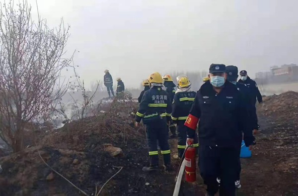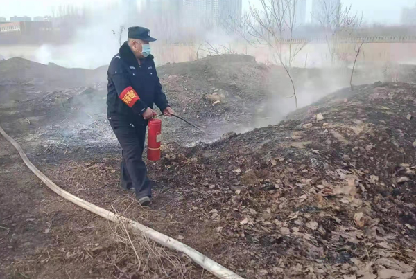 上午9時(shí)許,保安員屈國營、郭慶陽、李海軍、申安民巡邏至轄區(qū)中華路王官屯北路時(shí),看到路邊防護(hù)林草叢正在燃燒,由于天干物燥,火勢(shì)蔓延很快。隊(duì)員立即引導(dǎo)旁邊群眾疏散,撥打119消防電話報(bào)警,并從車上拿出滅火器冒著滾滾濃煙,全力撲滅大火,盡最大努力防止大火蔓延,避免造成更大的損失。雖然灰燼落滿了全身、汗水濕透了衣背、濃煙模糊了雙眼,但保安員依然斗志昂揚(yáng)、毫不畏懼。很快,消防救援人員趕到,保安員又配合消防人員,終將燃燒的干草撲滅。