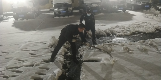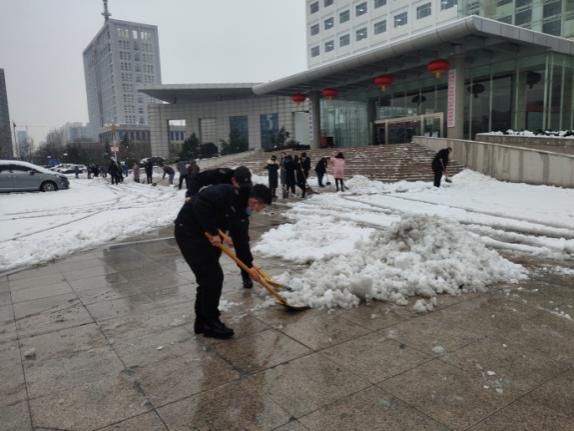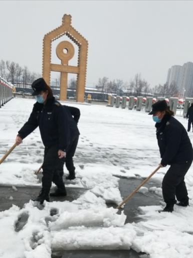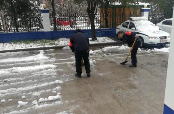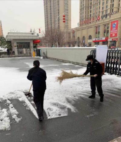 2月24日18時許,新年的第一場雪如期而來,飄落的雪花給特保大隊派駐崗點院內(nèi)道路上鋪上了一層厚厚的積雪,為了消除安全隱患,確??蛻魡挝活I導與工作人員的出行安全,特保大隊派駐各客戶單位隊員迅速行動起來,清掃積雪。隊員們周到的服務受到客戶好評。