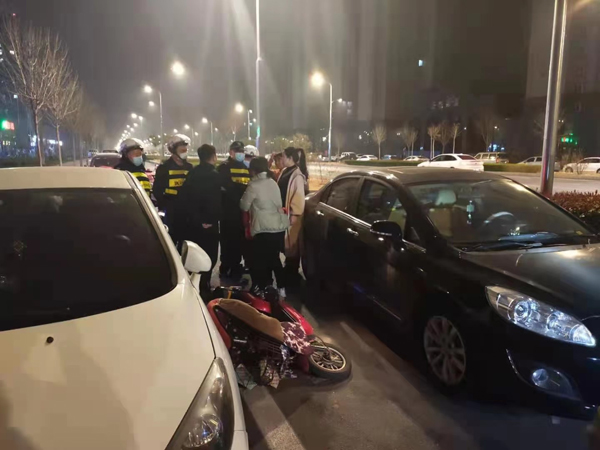 3月14號晚上8點(diǎn)40分左右,人防一大隊(duì)派駐高新區(qū)分局巡防隊(duì)徐強(qiáng)、郝文佺,閆志強(qiáng),孫守偉,宋立等5名隊(duì)員在轄區(qū)巡邏,行至開發(fā)區(qū)佳田未來城小區(qū)西門非機(jī)動車道看到一起交通事故。當(dāng)時(shí),事故雙方情緒激動,在激烈爭吵,還有一名小孩受輕傷。