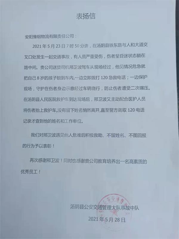 據(jù)悉,6月3日下午,湯陰縣公安交通管理大隊(duì)事故中隊(duì)工作人員曾帶著一封表?yè)P(yáng)信來(lái)到安陽(yáng)豫煙物流公司,感謝邢衛(wèi)波,對(duì)邢衛(wèi)波見(jiàn)義勇為,積極救助傷者的行為予以表?yè)P(yáng)。