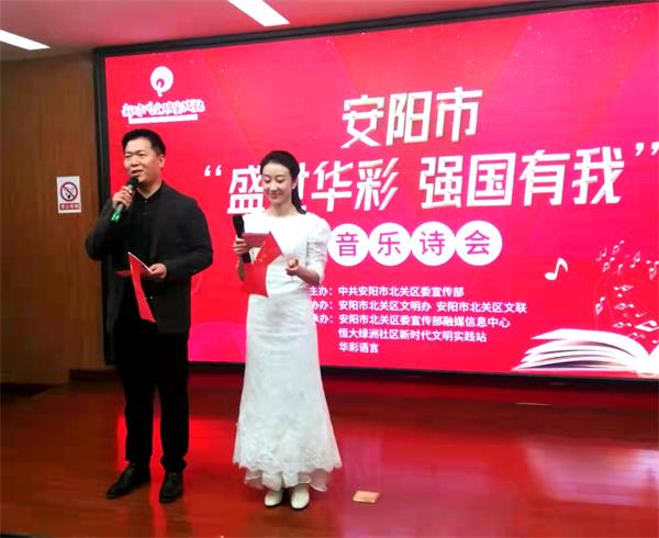 2021年10月17日下午,安陽市“盛世華彩 強(qiáng)國有我”音樂詩會在恒大綠洲社區(qū)新時代文明實踐站二樓宣講中心隆重舉行。安陽市總工會宣教部部長、市職工作家協(xié)會主席、市作家協(xié)會副主席、市文聯(lián)兼職副主席張艾敏觀看表演。公司培訓(xùn)中心王曉丹同臺獻(xiàn)藝。