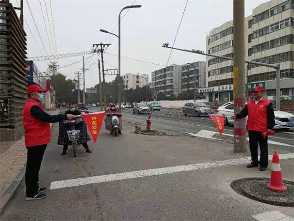 在規(guī)定的上崗時間,志愿者身穿紅馬甲、手持小紅旗,分別站在交通崗的四個出口方向值崗。時值路口人流、車流密集高峰期,同志們精神飽滿的揮舞著文明交通勸導旗,對橫穿馬路、闖紅燈等不文明行為積極制止勸導,為路況不熟悉的行人提供幫助,倡導大家共同關注交通安全,增強交通安全意識、法治意識和文明意識。